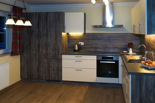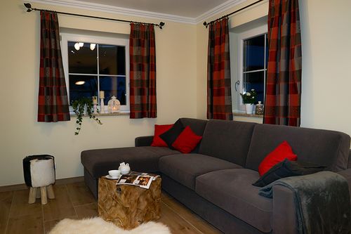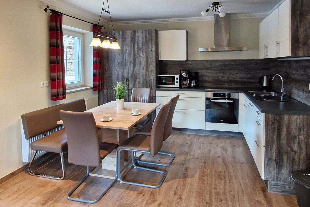 Unser großzügiges Ferienhaus bietet Ihnen eine geräumige Wohn-Ess-Küche, die mit allen notwendigen Küchengeräten ausgestattet ist. Ein gemütlicher Esstisch und eine kuschelige Couch laden zum Verweilen ein.